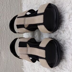 Clarks Artisan Women's Natural Light Tan Leather Elastic T-Strap Upper Round Open Toe Low Wedged-Heel Slip On Slingback Sandal Shoes. Man Made Sole. Leather Footbed. Elastic Gore Throat. Gore Cushioned Heel Strap. Upper Spot. Light Sole Wear. Measurement approx. Heel: 1". Size 6 M. Color May Vary Due To Lighting.