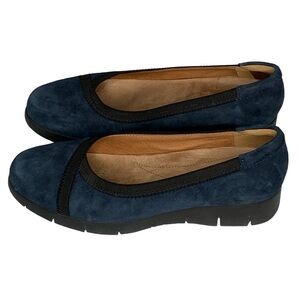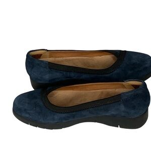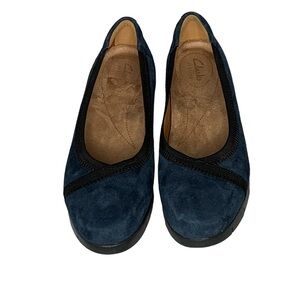 Clarks Artisan blue suede flat with 1 1/4” wedge sole. Size 8.5 runs long.