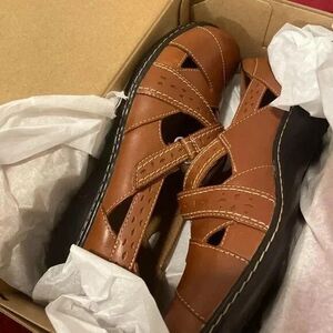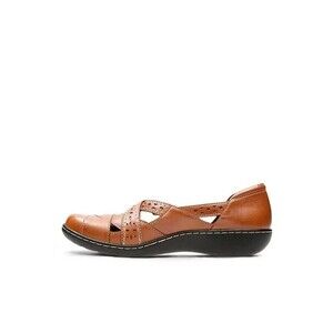 TITLE:Clarks Ashland Spin Q Dark Tan leather slip on SZ 7.5 M NIBDEPARTMENT:WomenCONDITION:NEWBRANDClarksITEMSHOESSIZE:7.5COLOR :DARK BROWNMATERIAL:LEATHERCLOSURE :BUCKLEFIT :fit true to sizeMEARSURMENTSNANO FLAWSDESCRIPTION:Everyday comfort is achieved in this lightweight, flexible clog detailed with perforated straps and features a well-cushioned footbed and slip-resistant sole.