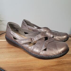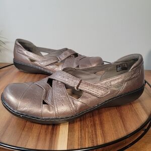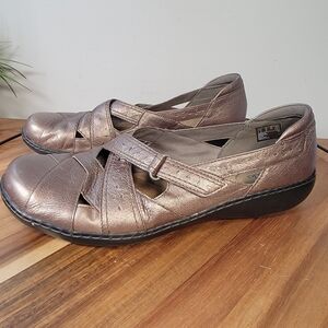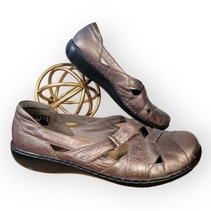 Metallic bronze leather loafers with hook and loop closure. Comfy, cushioned footbed.