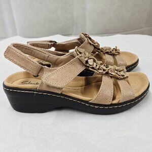 Elegant Clarks sandals with floral details. Soft straps for comfort. Ideal for everyday wear.