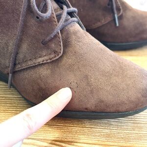 Description: Clarks suede brown lace up ankle boots with a wedge heel.