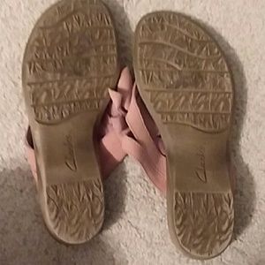 Suede coral and gold Clark's flops with slight heel. Barely worn