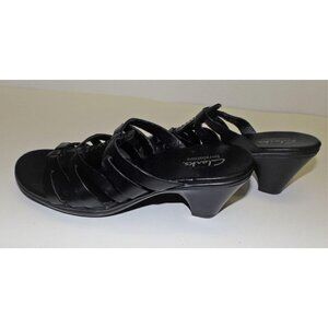 Black Clarks bendables 6M black leather sandals with 2.5" heel. Shoes are in excellent used condition - no signs of wear.