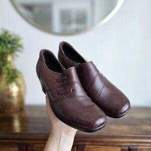 Tags: clarks bendables loafers brown leather heels comfortable shoes business casual office shoes workwear stacked heel shooties zipper shoes classic style timeless everyday comfort walking heels fall shoes womens size 9M