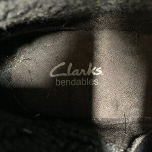 Clarks bendables ankle boot for women in black suede leather with matching black faux shearling lining. Comfort and warmth. Boots bend with the natural movement of the foot. The tops of the boots can be folded down to show the shearling lining or can be secured as taller boots with a tab and loop. Stacked heel is approx 2". Side zipper for easy on and off. Good preowned condition, light fading of the black suede at the toes and some pilling of the faux fur lining. Photos are part of the description, please zoom in for more details.