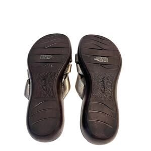Clarks Nice Bendables slip on sandals. With upper leather. A metallic gold with a flower design on the front. Very comfortable.In good pre-owned condition with light signs of wear. Women's Size 9M.