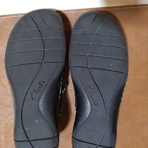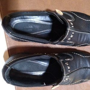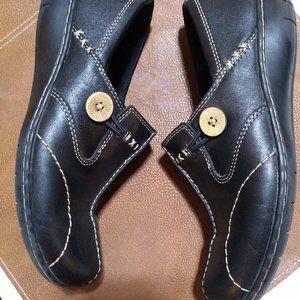 Black women's Clarks Bendables slip-ons with button detail, white stitching. Leather upper, manmade sole. Showing signs of wear (see pics) but still in good condition-lots of life left in them! Smoke-free home, let me know if you have any questions. :)