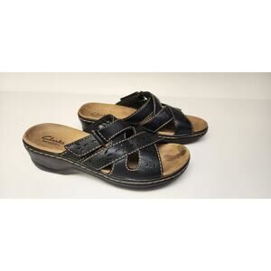 Clarks Bendables Wedge Open Toe Black Sandals Adjust Strap Leather Size 8.5M.