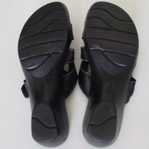 Clarks Bendables Womens Black Leather Slide Sandal w/ 2" Wedge Heel. Velcro Adjustable Strap. Size 7M. Previously owned and lightly used, leather uppers & interiors are both in excellent condition, as are the rubber non-slip soles & heels.