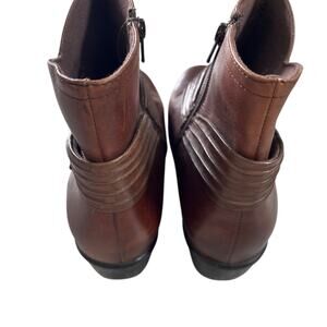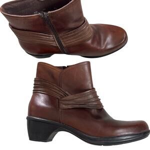 These Clarks Bendables Wish Mood ankle boots in brown leather are a stylish and versatile choice for women size 11W. The zip closure and pleated accents add a fashionable touch, while the block heel provides comfort and stability. Perfect for casual occasions in the winter, fall, or spring, these ankle boots are a practical yet chic option for any wardrobe.