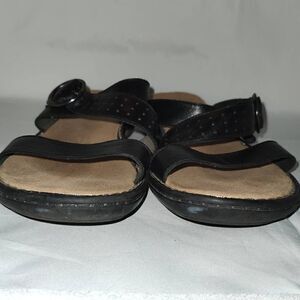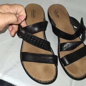 Clarks Bendables Women's Leather Slide Sandals Black w Adjustable Strap & Buckle. Gently worn. Size 11.