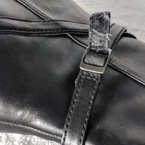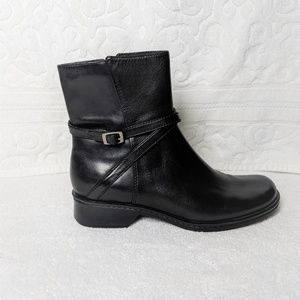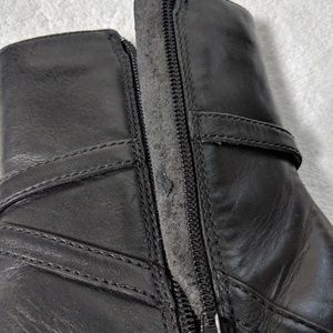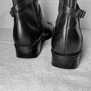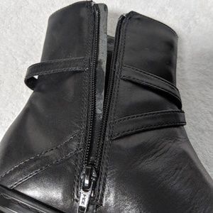 Clarks boots/ booties with a buckle strap accent. These have a cool moto boot vibe. Appx 1' heel & comfortable. The outside of the boots are in wonderful condition. Some minor scuffs on the back of the right heel, but barely visible. Lining inside near zippers of each boot & on the back side of the straps near the buckles (see last 4 photos) show wear. Zippers are stiff but work. These are marked a size 8, but also fit a size 7.5