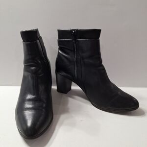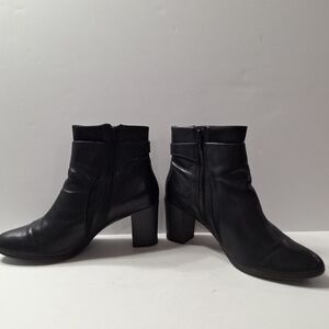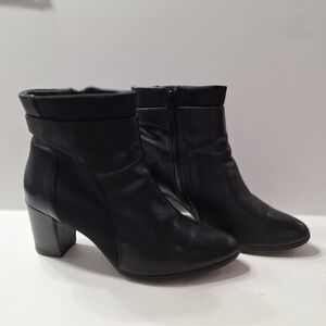 Step out in style with these classic Clarks black leather ankle boots. Featuring a sleek pointed toe, side zipper closure, and a sturdy block heel for all-day comfort. These versatile boots can be dressed up or down, perfect for both casual and formal outfits.