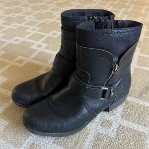 Clarks Black Leather Moto Ankle Booties Buckle Zip Fall Boots Size 8 (Approx)