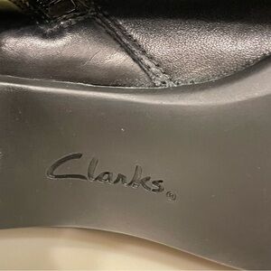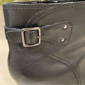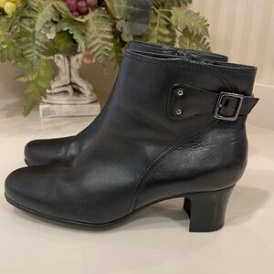 Clarks black leather heeled ankle boots. Side zip closure. Leather upper with rubber sole and 2 inch chunky stacked heel. Cushioned footbed. Buckle detail at top. Sleek and classy boots in excellent condition. Size 9