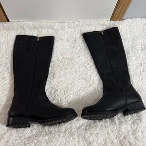 These stylish black over-the-knee boots feature a sleek design with elastic side panels for a comfortable fit and a decorative buckle for added flair. The low, flat heel and rugged sole make them perfect for everyday wear, while the matte finish adds a touch of sophistication.