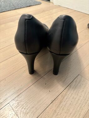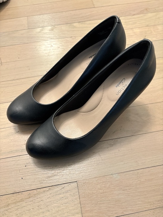 Almost new, slightly used Sleek black pumps by Clarks. Rounded toe for classic styling. Cushioned footbed for comfort. Smooth upper with a refined finish.