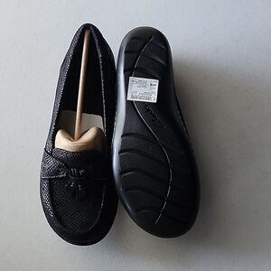Casual-Dressy black loafers. Professional and Stylish. Perfect for being on your feet all day - with a supportive insole; great paired with slacks or a solid color dress. Features a bow detail on the front, has a rounded toe for a relaxed fit, and a shiny textured finish. Step up your personality with these comfy shoes. Fits extra wide in the foot and accommodates an 8.5 WW or an 8.5 W with a sock.