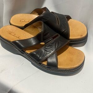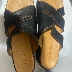 Clarks Black and Tan Comfort Sandals with Textured Straps NWOT