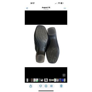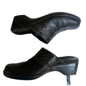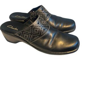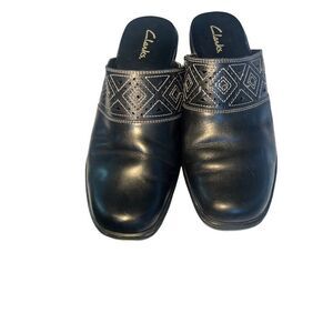 Black leather slip-on mules by Clarks featuring a low block heel and cushioned sole. The uppers have geometric stitched detailing in a diamond pattern along the sides and top . Size 10M.