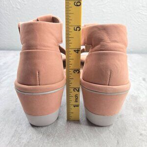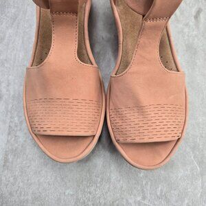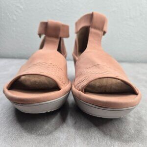 Elegant blush pink sandals by Clarks. T-strap design with cushioned wedge heel. Ideal for everyday wear.