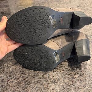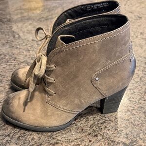 Step out in style with these chic tan/olive ankle boots. Perfect for any occasion, they offer both comfort and elegance. Wore once. Excellent condition. Comfortable booties.