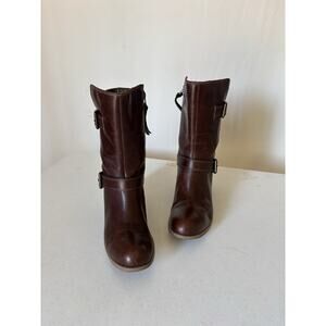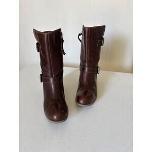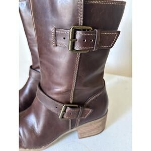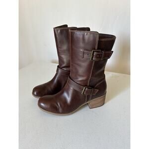 Clarks Boots 9 Womens Brown Leather Buckles Zip 2' Heel Round Toe