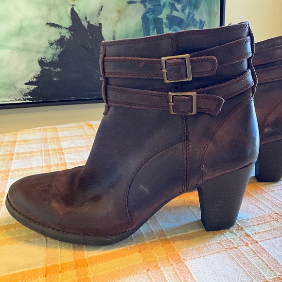 These Clarks Ankle Boots are size 11 with a 3 inch heel. They they zip up for ease and are in good condition. They are leather with a rubber sole.