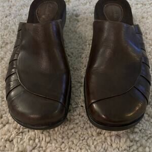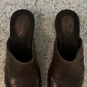 Clarks, size 7 Narrow, brown leather slip on mule shoes with slight height. Good, preowned condition, minimal signs of wear!