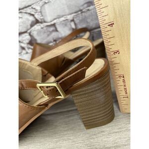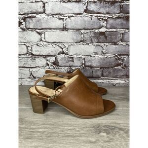Brown leather Clarks sandals in size 8.5 US/39.5 EU for women. These casual sandals feature a strappy design with an ankle strap and open toe. The mid block heel provides comfort and style. Made of leather with a rubber outsole, they offer cushioning, arch support, and breathability. Suitable for travel, parties, work, or casual wear during summer, fall, or spring. The design includes a Clarks logo accent.