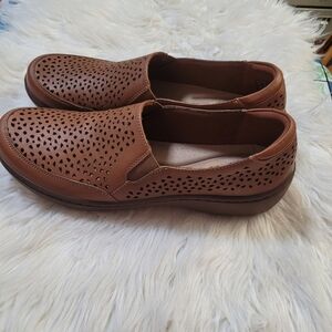 Stylish Clarks loafers with a perforated design. Comfortable slip-on style. Perfect for casual wear.