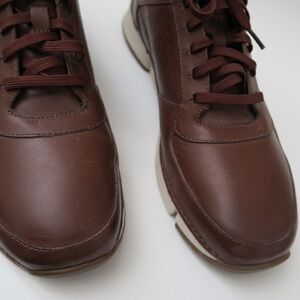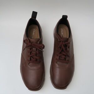 Leather brown lace up sneakers by Clarks, lace up. Preloved condition, minor discoloration mark throughout. Please see pictures.