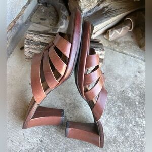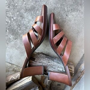 Clarks brown sandals feature a stylish slip-on design with multiple leather straps for a comfortable fit. Made in Brazil. Pre owned in good condition.