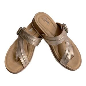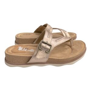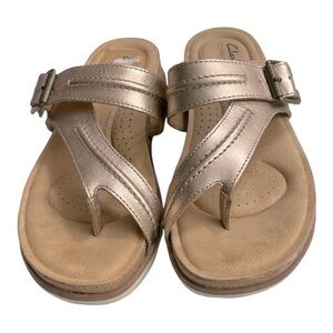 Clarks Brynn Madi Sandal in Leather Rose Gold Size 9M. Ultimate Comfort pillowtop footbed, together with a flexible, light, and grippy sole, adjustable buckle. Heel height 1.5"