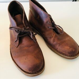 Clarks Bushacre 2, Beeswax Leather, Chukka Boots, Men’s Size 8, Medium Brown (The color is labeled as Beeswax Leather on their website), Lace Up Ankle, 34135. Manufacturer distressing, These are lovely! The last photo in this listing is a model photo showing the fit of these boots and not the actual boots you will receive. In good used condition.