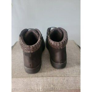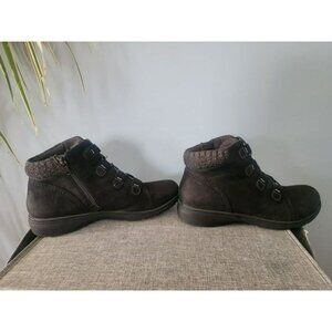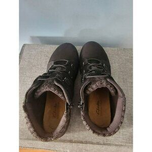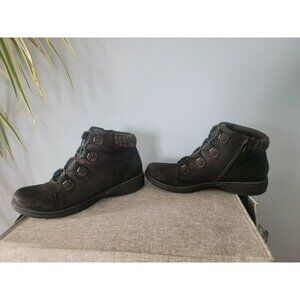 Elevate your style with these Clarks Carleigh Jade ankle boots. Size 9.5M The black/dk brown/grey multicolor nubuck leather (leather looks black in some light and brown in other light) the pictures look more brown but in person they appear more black and have a knit rim. The boots feature a round toe and lace-up closure for a comfortable fit. Perfect for travel, parties, casual outings, and even weddings, these boots are versatile for any occasion.