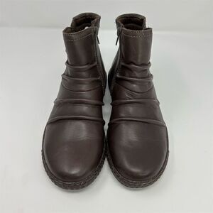 Keywords: Clarks bootie, women's leather boots, brown ankle boots, Clarks Caroline Orchid, ruched design boots, Ultimate Comfort footbed, zip closure boots, pre-owned Clarks boots, women's size 9.5 Wide boots, EU size 41 boots, leather upper material, rubber outsole boots, women's fashion boots, Clarks women's footwear.