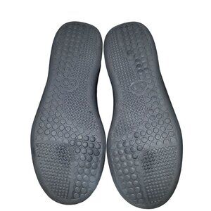 FEATURES/ACCENTS: Low flat Wedge heel. Round moc toe. Comfort, cushioned footbed. Patten leather strap Glitter, Logo Wine/Burgundy color. Slip on style.
