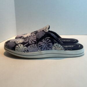Clarks Cloudstepper Breeze Shore mules. Size 9.5M. Slip on. Washable. Cushion soft. Tropical print. Navy white and lavender. Canvas.