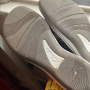 Experience comfort with Clarks Cloudsteppers. Features black straps and white accents. Perfect for everyday wear.
