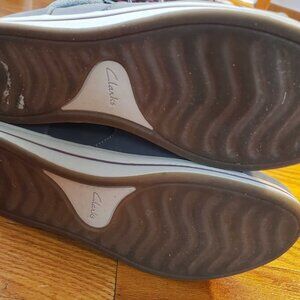 Great condition, comfortable women's 7.5M blue-gray Clarks Cloudsteppers Breeze Glide high tops. Original box included. Worn less than 10 times! Either lace them up or zip on/off. These shoes are padded, have good arch support, and almost no heel lift. Selling because they're too small and squish my toes due to sizing. I have since bought them in a bigger size and they are SO comfortable, and I'm very picky with shoes.