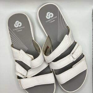 Experience ultimate comfort with Cloudsteppers by Clarks sandals, featuring a sleek gray and white design. These sandals boast adjustable straps for a personalized fit and a smooth sole for easy walking. Perfect for casual outings, they combine style and functionality effortlessly.