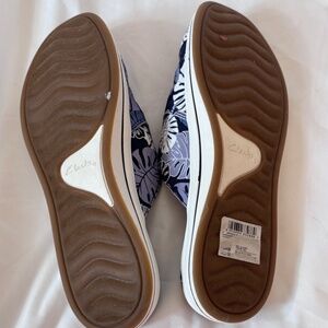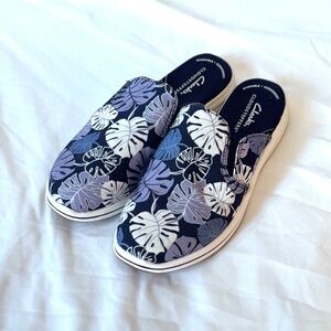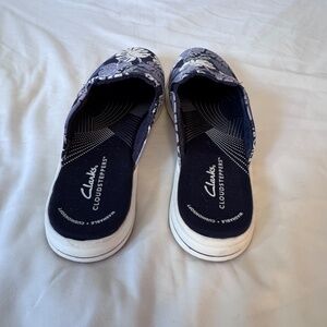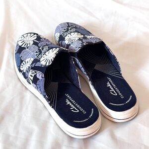 Clarks, Clarks Cloudsteppers, Cloudsteppers, Clarks Shoes, Breeze Shore, Mules, Slip Ons, Comfortable Shoes, Travel Shoes, Palm Leaf Print, Washable Shoes, Casual Style, Navy Shoes, New With Tags, Size 7 Sneakers