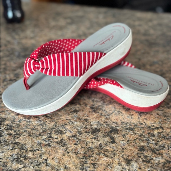 Clarks Cloudsteppers Red & White Striped Wedge Flip Flops | Size 8