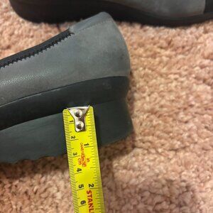 The Clarks Cloudsteppers Shoes in Dash Gray are stylish and comfortable slip-on pumps designed for women. With a low wedge heel, cushioned insole, and breathable synthetic lining, these shoes are perfect for casual wear or travel. The round toe shape and synthetic outsole provide durability and support for walking activities. Made with synthetic upper material, these lightweight and cushioned shoes are ideal for all seasons and can be easily paired with various outfits. Displaying the signature Clarks brand and Cloudsteppers design, these shoes are a practical and fashionable choice for everyday wear. Size 9M. Inside cushions are removable and can be changed out!