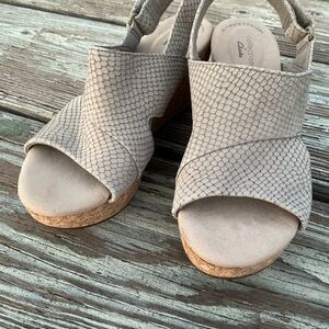 Stylish Clarks wedges with textured straps. Comfortable cork sole for all-day wear.