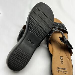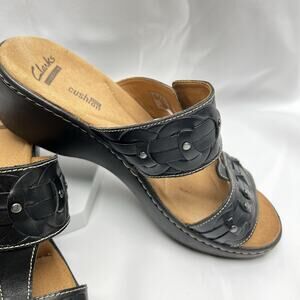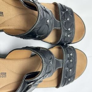 Clarks Collection Black Leather Wedge Sandals Size 7 Studded Adjustable Braided