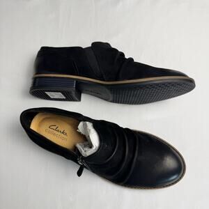 These are new Clarks Collection Camzin Pace shoes in black nubuck leather, size US 9M. They feature a side zipper closure and a low heel. The shoes have a ruched design on the vamp and a synthetic sole. The shoes are in new condition with original tags and box. There are no visible imperfections.