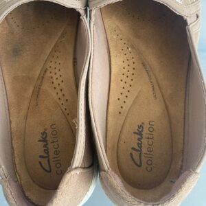 Clarks Collection Elaina Harbor Warm Beige Embroidered Canvas Slip-Ons Size 9 Nice Condition